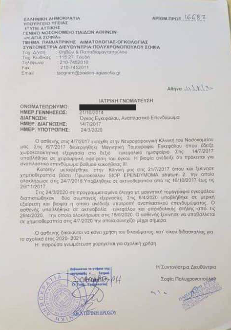 Η ασθένεια του μικρού, εμφανίστηκε το 2017, όταν έκανε την πρώτη μαγνητική, μετά από κάποιες ενοχλήσεις που είχε στο κεφάλι και στο περπάτημα του. Στις 14 Ιουλίου του ίδιου χρόνου, έγινε η πρώτη επέμβαση όπου διαγνώστηκε με όγκο – επενδύμωμα 3ου σταδίου. Έπειτα, υποβλήθηκε στις προβλεπόμενες χημειοθεραπείες και ακτινοβολίες με σκοπό την θεραπεία της νόσου. Καθ’ όλη τη διάρκεια της θεραπείας αλλά και μετά την επιτυχή ολοκλήρωση αυτής, οι ιθύνοντες ιατροί συνέστησαν τακτικό έλεγχο της κατάστασης μέσω εξετάσεων.
