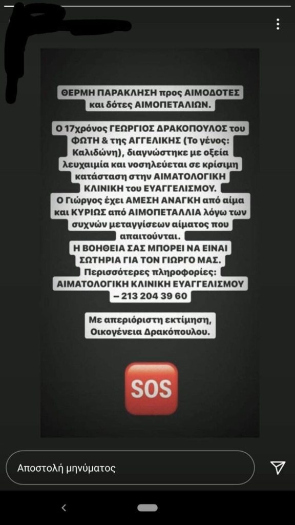 Έκκληση για αίμα και αιμοπετάλια απευθύνει η οικογένεια του 17χρονου μαθητή Γιώργου Δρακόπουλου, μαθητή του 1ου ΓΕΛ Αγίου Δημητρίου, που διαγνώστηκε με οξεία λευχαιμία και νοσηλεύεται σε κρίσιμη κατάσταση στην Αιματολογική Κλινική του Ευαγγελισμού.