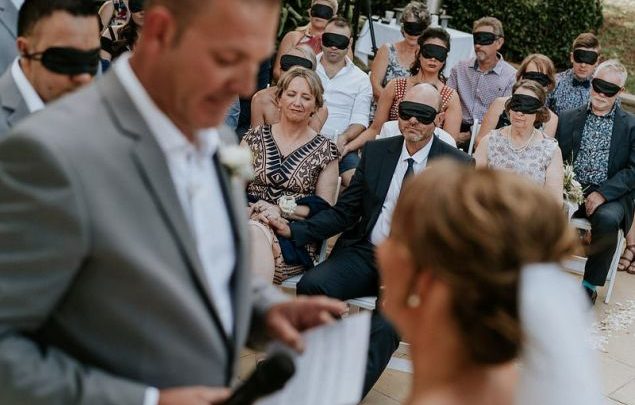 Αντί να δουν την τελετή στο Μαλένι του Κουίνσλαντ, οι 54 καλεσμένοι κλήθηκαν να φορέσουν μάσκες στα μάτια τους για να μπορέσουν να βιώσουν κάθε στιγμή του μυστηρίου όπως η νύφη η οποία είναι τυφλή.