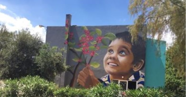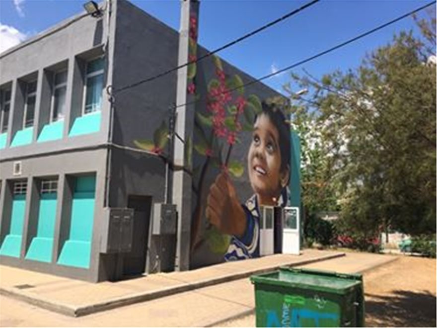 Ο καλλιτέχνης ζωγράφισε με γκράφιτι στην όψη ενός κτιρίου στη Ραφήνα ένα μικρό παιδί που φυτεύει ένα κλαδί που αντί για καρπούς έχει 102 καρδιές